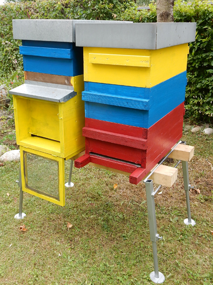 Magazinbock der auch perfekt als Wanderbock gebraucht werden kann. Ergonomisch an die Körpergrösse des Imkers anpassbar. Damit kann die Bewirtschaftung der Völker möglichst rückenschonend eingerichtet werden. Besonders bei mehrzargigen Magazinen ist es sinnvoll diese in Zweiergruppen aufzustellen und von der Seite her zu bewirtschaften.